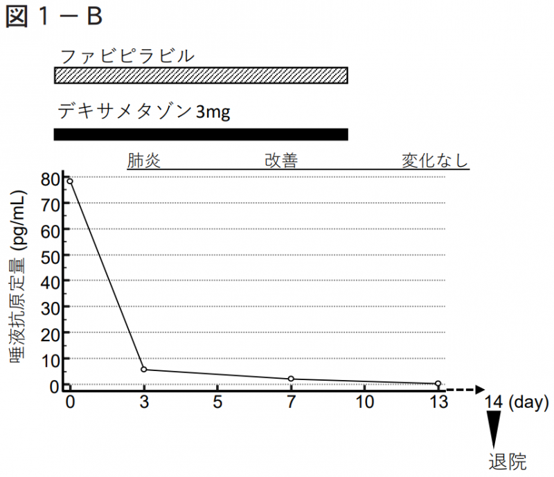 中年、男性。別陽性者からの濃厚接触後、polymerase chain reaction(PCR)陽性が判明し、後に発熱症状が出現した。症状、所見:発熱あり(37.9度)、下痢症状あり、酸素飽和度95-97%(室内気)、当初肺炎を認めなかったが、day3にて出現を認めた。臨床経過:ファビピラビルを開始したところ、day3に解熱し、day6に下痢症状は消失した。day14で退院した。肺炎経過は図1-Bに示す通りであった。