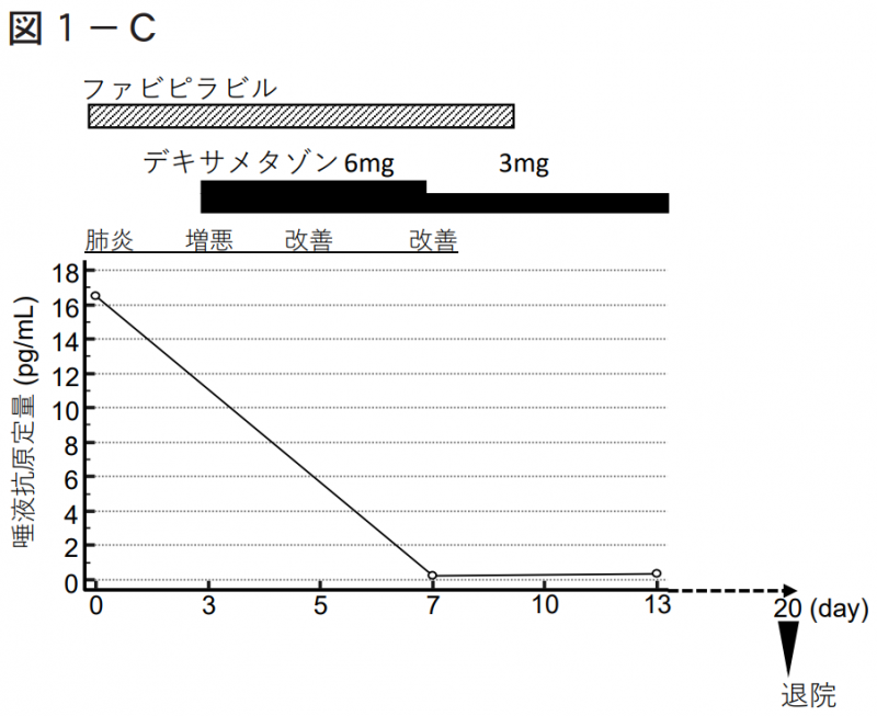 中年、男性。感冒症状で発症した。症状、所見:発熱あり(38度台)、呼吸症状あり(咳嗽、痰)、酸素飽和度96%(室内気)、胸部HRCTにて両側下肺に肺炎像を認めた。臨床経過:ファビピラビルを開始したところ、day3に解熱し、day5に呼吸症状は消失した。day13で退院した。肺炎経過は図1-Aに示す通りであった。