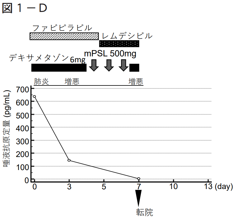 Case1,2,3,4,5,6に対し、経過図1-A,1-B,1-C,1-D,1-E,1-Fを各々示した。経過図の縦軸は唾液中抗原定量、横軸は時間経過を示した。また投与薬剤名と治療期間を示した。肺炎について、経時的に前画像より陰影縮小、減少、消失を示した場合、改善とした。また横ばいでも臨床的に呼吸症状の改善を示した場合も改善とした。前画像より陰影拡大、新規陰影の出現は増悪とした。横ばいでも、呼吸症状が悪化した場合は増悪とした。mPSL:メチルプレドニゾロン