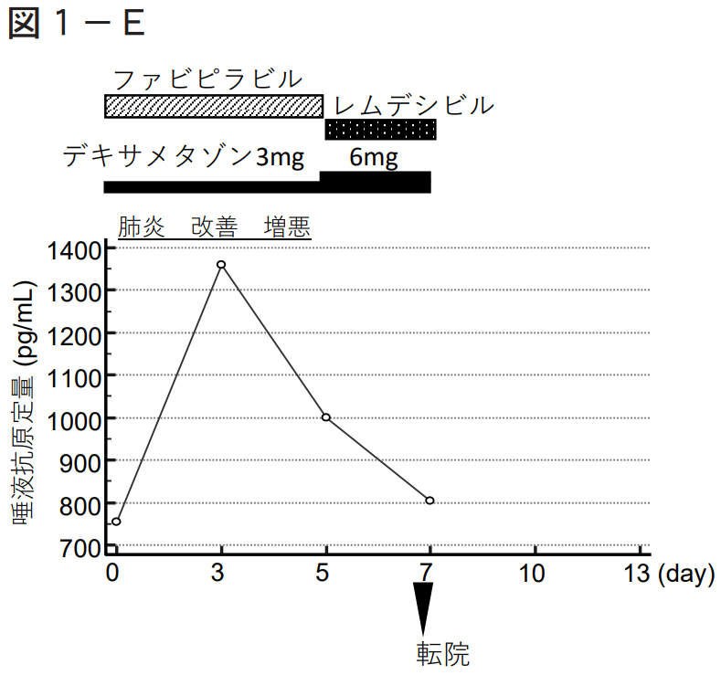 高年、男性。別陽性者からの濃厚接触後、感冒症状で発症した。入院時唾液中抗原定量は著明高値(5,000pg/mL)であった。症状、所見:発熱なし、呼吸症状あり(咳嗽、咽頭症状)、酸素飽和度93%(室内気)、胸部HRCTにて右下肺に肺炎像を認めた。臨床経過:レムデシビルを開始したところ、day3にて呼吸症状は改善方向を示した。レムデシビル5日間投与終了後、依然として呼吸症状が持続することから追加治療としてファビピラビルを3日間投与追加したが、症状改善せず、レムデシビルを再投与した。day13では症状は消失した。day18で退院した。肺炎経過は図1-Fに示す通りであった。(図1.症例の臨床経過図)