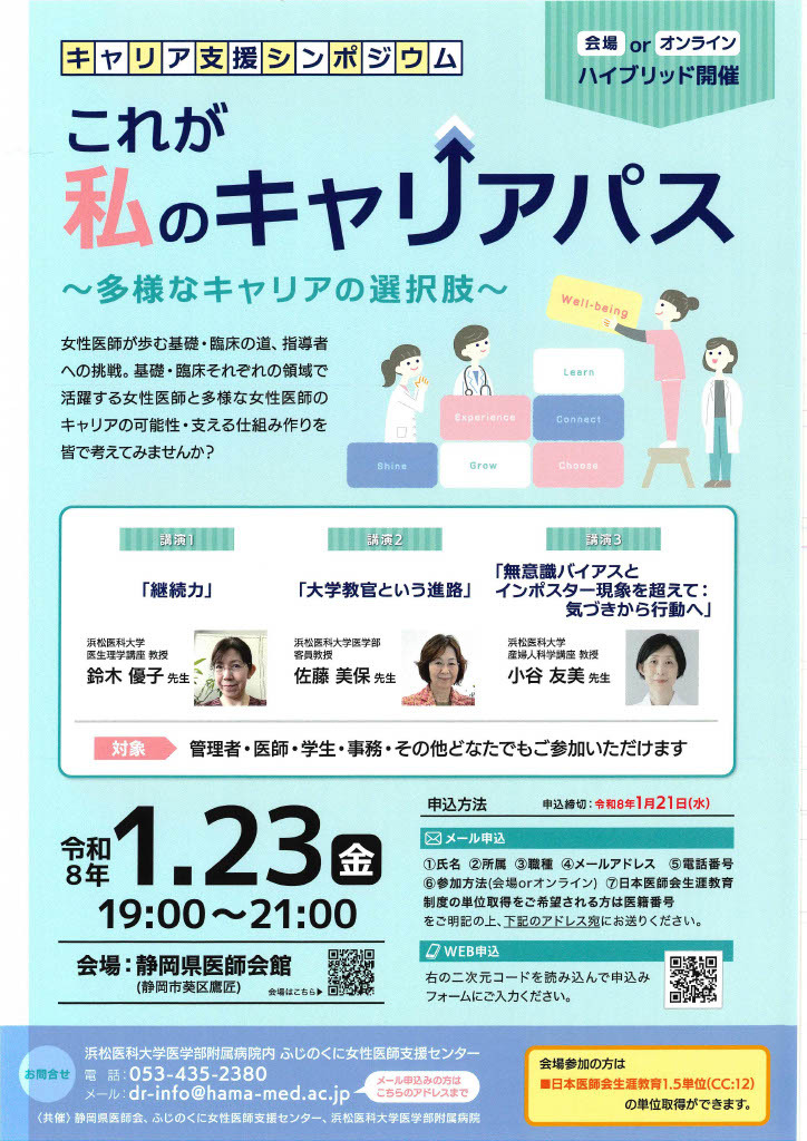 ふじのくに女性医師支援センターから、今回で第8回目となるキャリア支援シンポジウム『これが私のキャリアパス~多様なキャリアの選択肢~』の開催案内がありましたので、お知らせいたします。