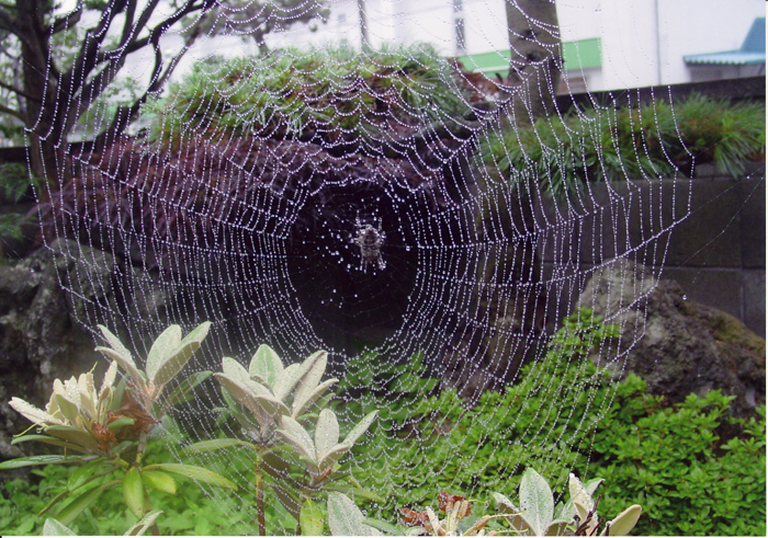 ある雨上がりの日、さわやかな青空と眩しい日の光に誘われて外にでた。ひさしぶりに木々の鮮やかな緑に身も心も洗われ、爽快な気分になった。庭の松と石楠花の陰にきらきらと輝いているものに氣を引かれた。近づいてみて、なお驚いた。大きな蜘蛛の巣は雨の滴で小さな宝石のシャンデリヤのようであった。強い雨と風によく耐えて美しい造形を保っているのに驚嘆いたしました。芥川の「蜘蛛の糸」がふっと脳裏をよぎった。